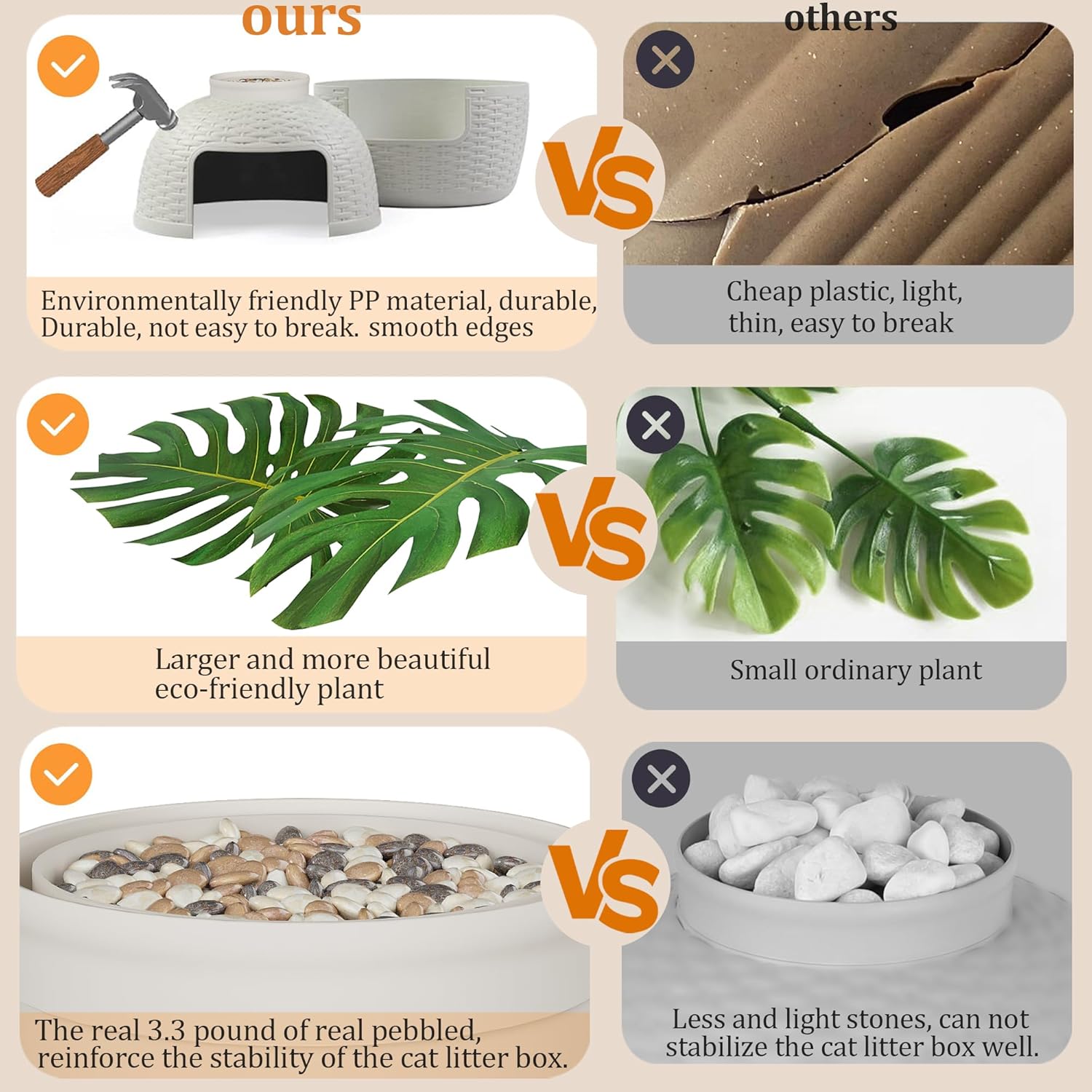 - 【Heavy Duty Polypropylene & Natural Stones】Not cheap materials, our plant litter box made of heavy duty Polypropylene, which is heavier and stronger. In addition, we add high quality stones to the top of the enclosed litter box furniture, no matter how the cat climbs and scrapes, this litter box plant will not topple down.
