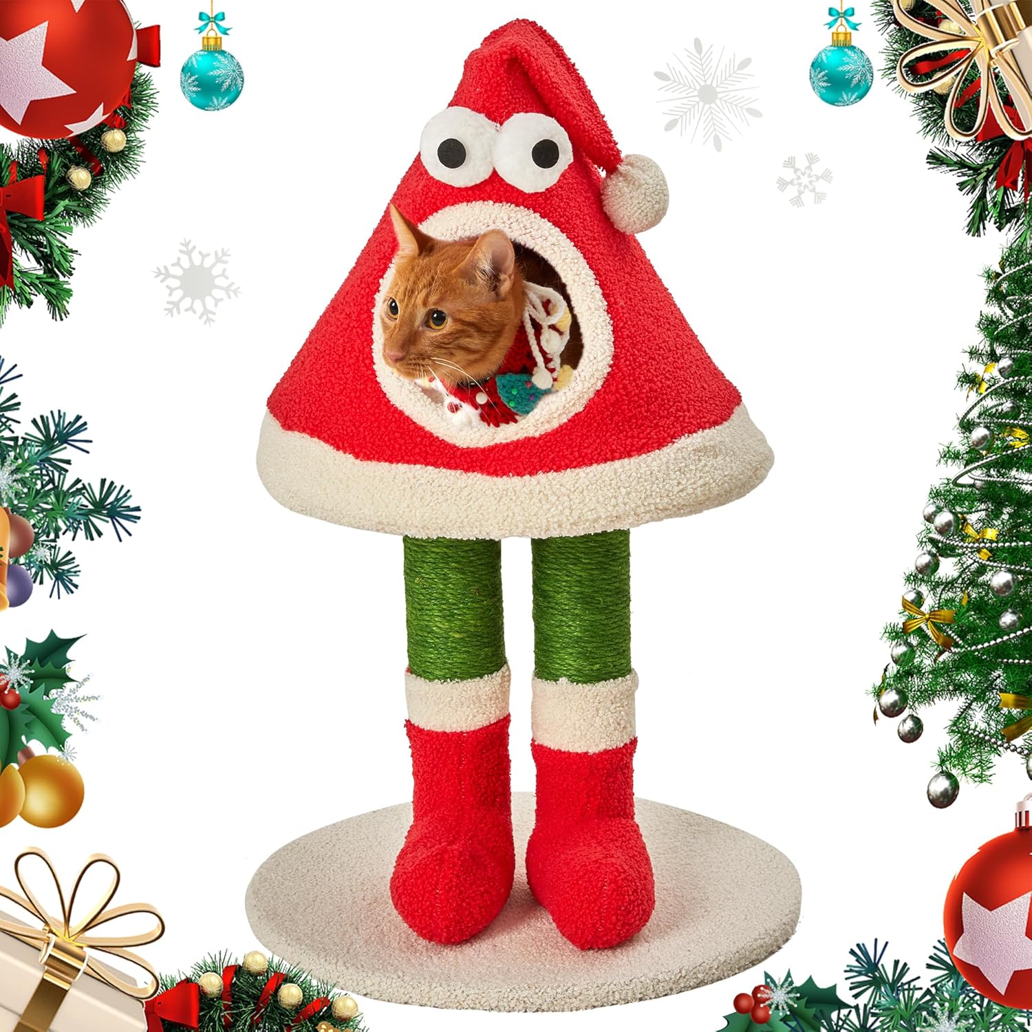 Festive Christmas Hat Design:This Christmas cat tree tower features a cute red-and-white Santa hat shape that instantly brightens your holiday d¨¦cor. Perfect as a cat tower for indoor cats, Christmas cat tree, or cat room decor, it adds festive charm while providing a cozy cat playground. This cat tree christmas tower not only looks adorable but also doubles as a cat house indoor¡ªa seasonal hideaway your furry friends will love.Multi-Functional Cat Playground:Designed as a modern cat tree and cat climbing tower, it lets cats scratch, climb, nap, and play all in one space. With built-in cat scratching posts and sisal cat scratcher surfaces, it protects your furniture while keeping cats active. Ideal for both kittens and adults, this cat tower with scratching post serves as a cat jungle gym, cat bed for 2 cats, and cat toys for bored indoor adult cats¡ªbringing joy and comfort all season long.Stable & high-quality Construction:Built from P2-grade wooden boards and sisal cat scratch posts, this wooden cat tree is sturdy and stable enough for daily climbing. Supporting up to 33 lbs, it¡¯s suitable for a cat tree for large cats 20 lbs or multiple smaller cats. Whether used as an adult cat tower, cat tree small, or cat tower cute, it offers reliable durability with a safe, eco-friendly finish.Soft & Cozy Materials:Covered in plush teddy fleece, this cute cat tree feels soft and warm¡ªideal for winter lounging. It¡¯s a cat bed for indoor cats, christmas cat bed, and small cat bed all in one. Cats can curl up, nap, or stretch comfortably, making this cat tree aesthetic a cozy haven during the holidays and beyond.Space-Saving Vertical Design: This small cat scratching post fits perfectly in any room. The narrow cat tree shape maximizes vertical play space without taking up floor area. Whether placed in a corner or near your couch, this cat tower christmas tree enhances your home while keeping your cats entertained and active.